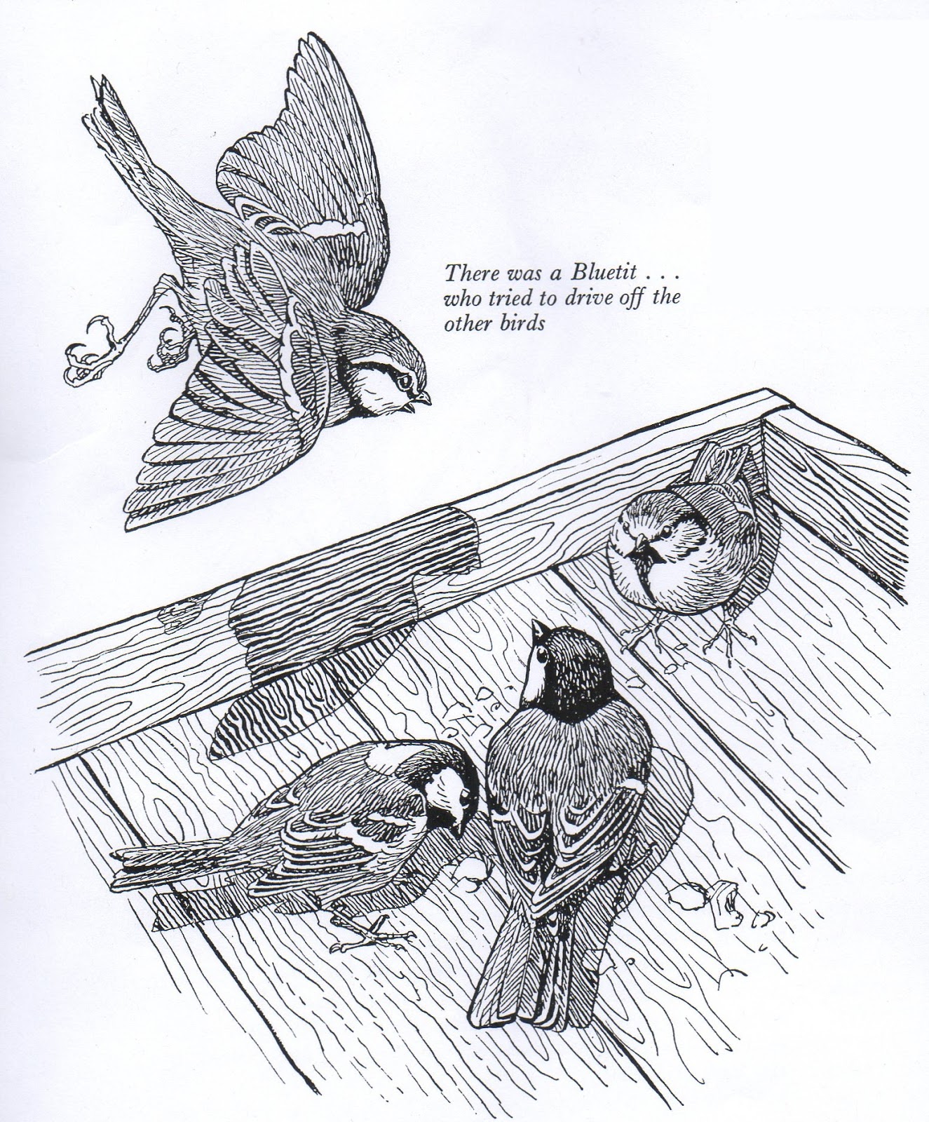 The first illustration shows a tit being cjhased by a Nuthatch and then pages 62 and 63 read "There was a Bluetit ...who tried to drive off the other birds"; "The Great tit visited the board next"; "The Nuthatch pickaxed away until he got them all out"; "The only other visitor for a while was the Missel Thrush". Here we can see Sheppard's years of study put to good use - it's very unlikely anyone would find a reference photo of the first illustration! Also his two books on drawing birds first published by The Studio Publications show his skills in construction and execution of bird drawings.